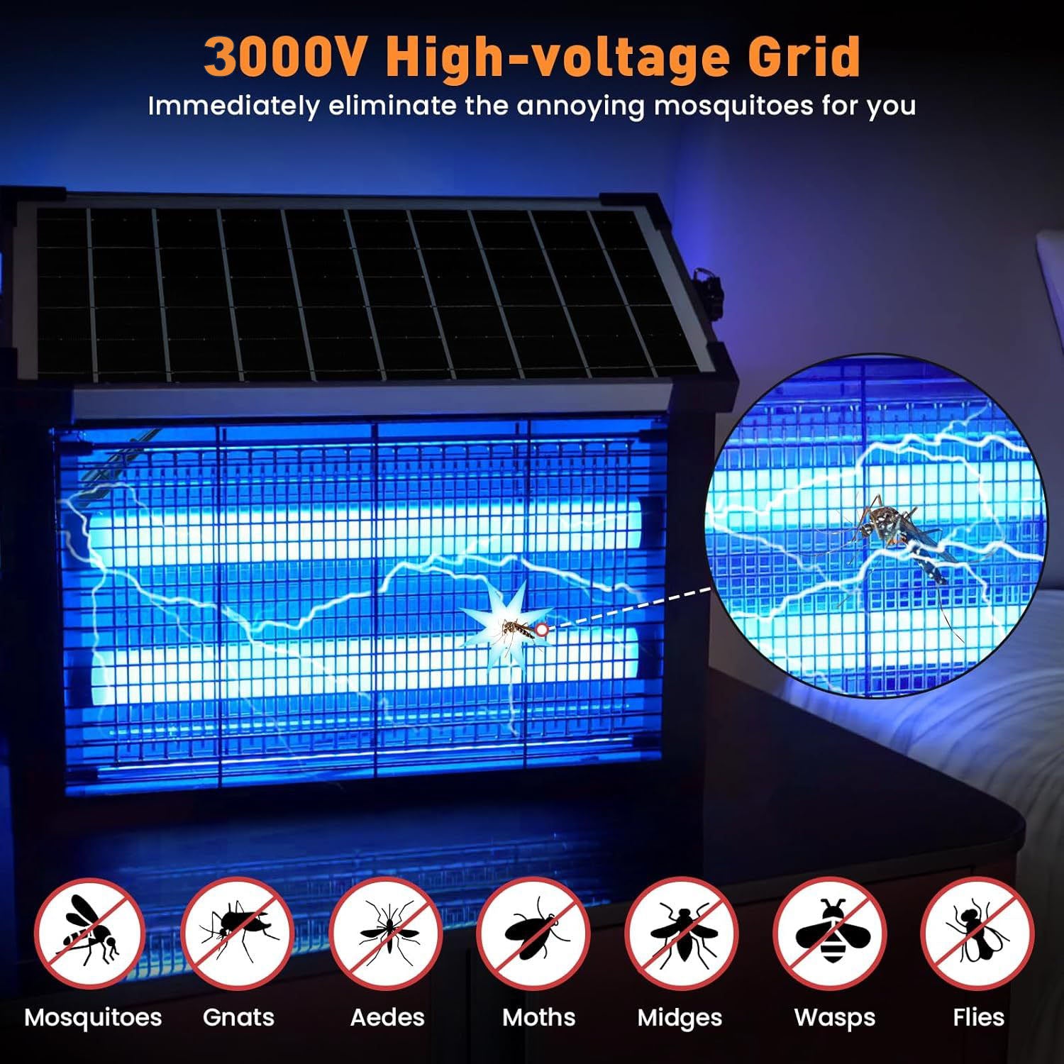 Upgraded Solar Bug Zapper: This advanced solar-powered bug zapper, uses a special light wavelength to lure and eliminate pests with a 3000V grid. Safer and more eco-friendly, it comes with a safety net to protect kids and pets from shocks. This powerful device can keep an area of 2100 square feet free from flies, mosquitoes, wasps, moths, and other flying insects.